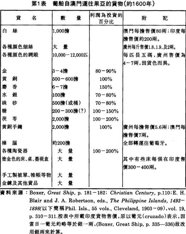 由澳門輸往果亞的中國貨物,以絲貨(生絲及絲織品)為最大宗。以蠶絲著稱的中國,產絲遍於全國各地,但其中以江蘇、浙江間的太湖區域尤為重要。江、浙出產的絲貨,有不少遠道南運,以廣州為集散中心。(25)為着便於絲貨的大量交易,廣州每年夏冬兩季都舉行定期市,每次開市數星期,或長至數月。在冬季成交的絲貨,多輸出至印度、歐洲及菲律賓;在夏季成交的絲貨,多運往日本出賣。(26)澳門和廣州距離很近,而葡人航海技術又很進步,自然在廣州收購大量絲貨,轉運出口,以便從中取利。其中由澳門運往果亞的生絲,在一五八○至一五九○年,每年約為三千餘擔;其後到了一六三五年,有人記載多至六千擔,不過這個數字顯然有些誇大。(27)除生絲外,絲織品及其他中國貨物,也都由葡船自澳門運往果亞出賣,可是價值遠不如生絲那麽大。現在把一六○○年左右一艘葡船自澳門運往果亞的中國貨物名稱、數量及利潤,列表如下(見下頁)。