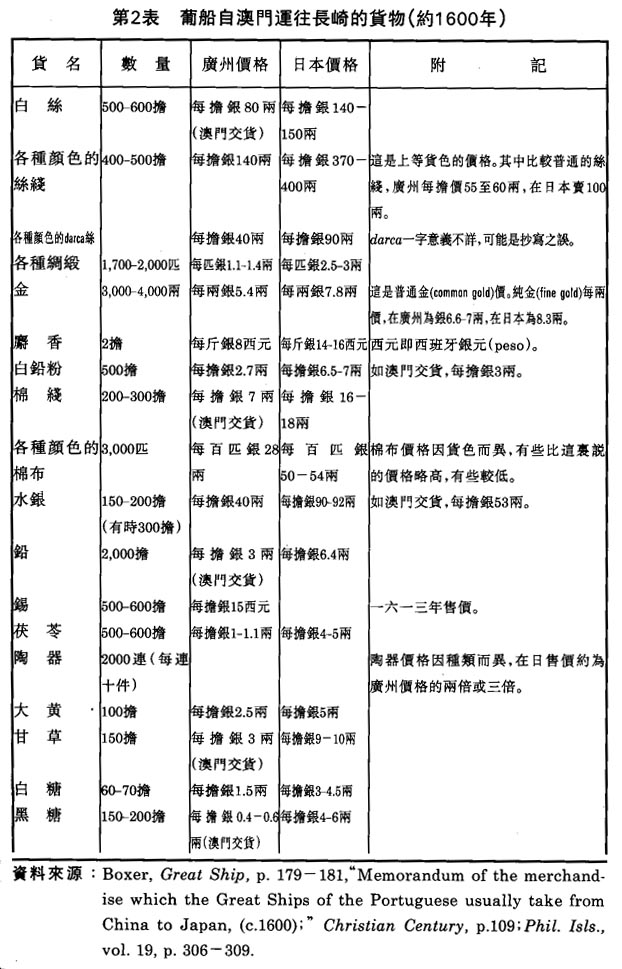 根據第二表,我們可知,在十六、七世紀間,廣州市場上各種中國貨物的價格,和在日本的售價比較起來,差别非常之大。兩國間的貨價既然這樣懸殊,葡人自澳門運往長崎出售,當扣除運費、關税等項開支以後,自然可以獲利。不特如此,在當日因倭寇侵擾,而中、日間不能直接通商的情況下,葡人有機會充任兩國貿易的媒介,從而澳門成為日本市場上中國貨物的主要來源。這樣一來,日本人消費的中國貨物,既然大部份都倚賴葡船運來供應,在日本的華貨輸入貿易中葡人便幾乎處於獨佔的地位,從而更可提高售價。因此,經營澳門、長崎貿易的葡人,把買賤賣貴的原則運用得非常成功:他們在價格最便宜的市場上收購貨物,而在價格最昂貴的市場上出售。(51)他們這樣經營的結果,經常獲得的利潤,高達等於投資的百分之一百。(52)