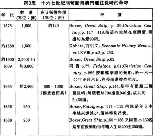 由於鉅額利潤的吸引,澳門葡人自然努力擴展對日貿易。在十六、七世紀之交的若干年內,葡船每年運往長崎的中國貨物,約值銀一百萬兩以上;(53)及一六三七年,增加至2,141,468.05兩;(54)其後更超過三百萬兩。(55)在輸入長崎的各種中國貨物中,生絲更是價值特别大的一種。兹根據有關記載,撰成第三表。