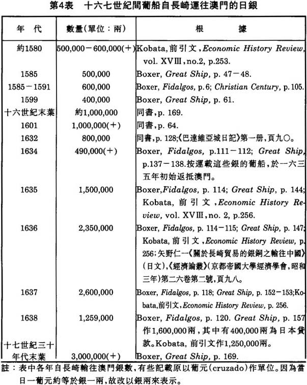 在十六世紀最後二十五年內,日本出產的白銀約有一半輸出國外,而輸出的大部份都由澳門葡人運走。(61)在這個時期內,自長崎運往澳門的銀子,如第四表所述,每年約為五六十萬兩。其後到了十七世紀,在最初三十餘年內,每年約為一百餘萬兩,有時更多至二三百萬兩。另據一個統計,自一五九九至一六三七年,三十八年間,葡船自長崎輸出銀58,000箱(每箱一千兩),即58,000,000兩。(62)這許多自日運往澳門的銀子,大部份都轉運人中國,用來購買輸日絲貨及其他商品。(63)有人佔計,葡人每年在廣州購貨,約用銀一百萬兩,或一百萬兩以上。(64)此外,當日澳門葡人日常生活的消費品,既然都來自中國,中國人自然有機會自葡人那裏賺取更多的銀子了。