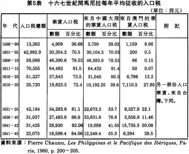 根據表中馬尼拉華貨人口税的記載,我們可以推知,在十六七世紀間,馬尼拉輸人的華貨,主要由中國大陸直接運往,由澳門轉運前往的華貨,所佔比例不大。但自一六一六至一六二○年間開始,自澳門輸入的華貨卻越來越多,到了一六四一至一六四二年間,更多過直接自中國大陸輸入的貨物。