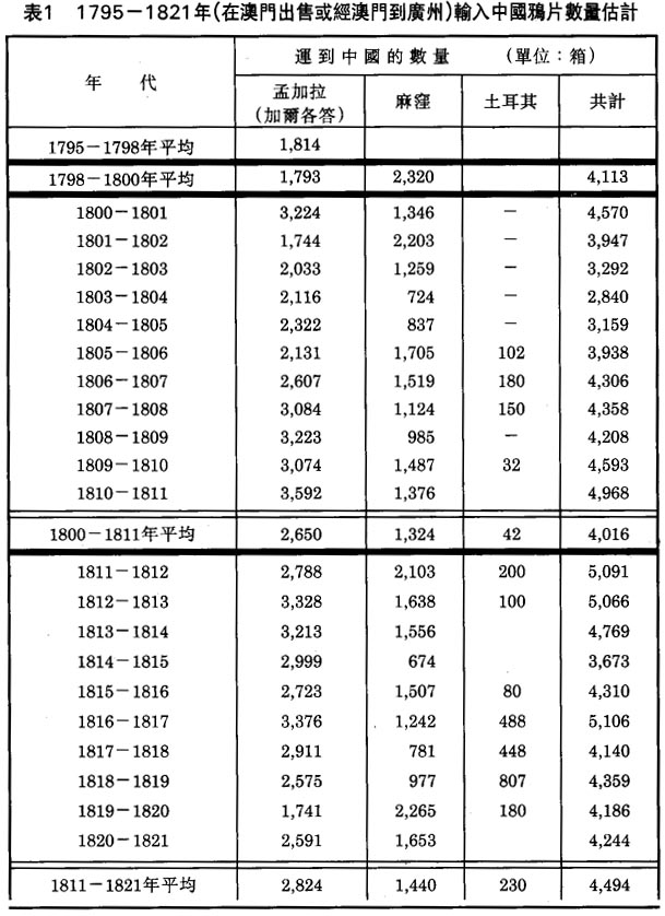 馬士在《英國東印度公司對華貿易編年史》中,對這段時期的鴉片貿易作過一些統計,兹據此列表如下: