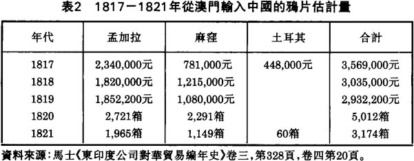 比較表1、表2可見,1820-1821年度輸人中國的鴉片總數為4,244箱,同年,經澳門銷售的就佔3,174箱,在澳門以外(主要是黄埔)銷售總數為1097箱,從這個數字可以清楚地看出,經澳門銷售的鴉片佔輸入中國的鴉片量的四分之三。因此,當時澳門是名符其實的中國鴉片走私貿易中心。