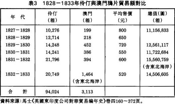 從上表可看出,澳門在這個時期的鴉片貿易與伶仃比較起來,確實是微乎其微。6年中,輸入伶仃的總數為94,024箱,輸入澳門僅為3,113箱,祇及伶仃的3.3%。