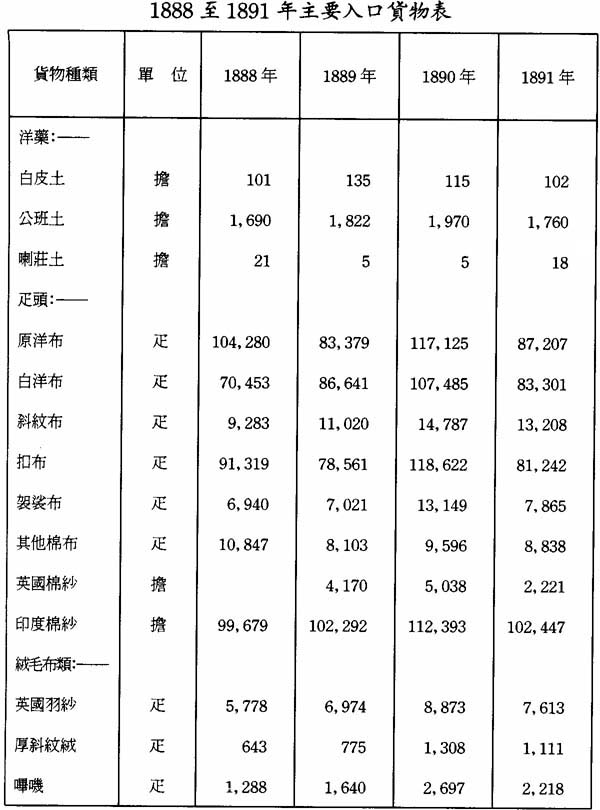 洋藥入口至1890年底每年都有穩定增長,但在1891年卻急劇下降。不過,經由本省各關入口之洋藥多有交相重叠的現象,此處減少,則有彼處增加以爲禰補。因此將各府經本關入口的洋藥與經由其他通商口岸及關卡入口的洋藥作一比較,不裨益。玆列表如下: