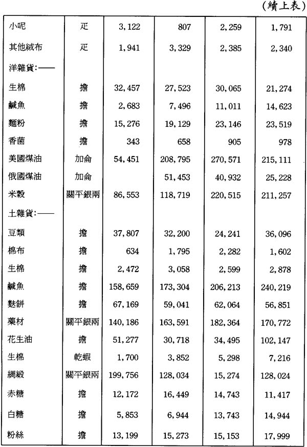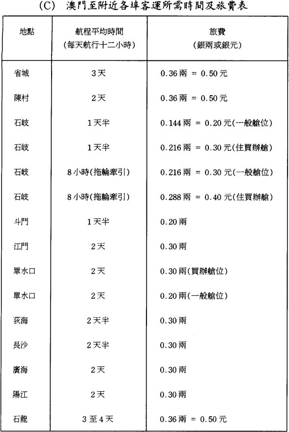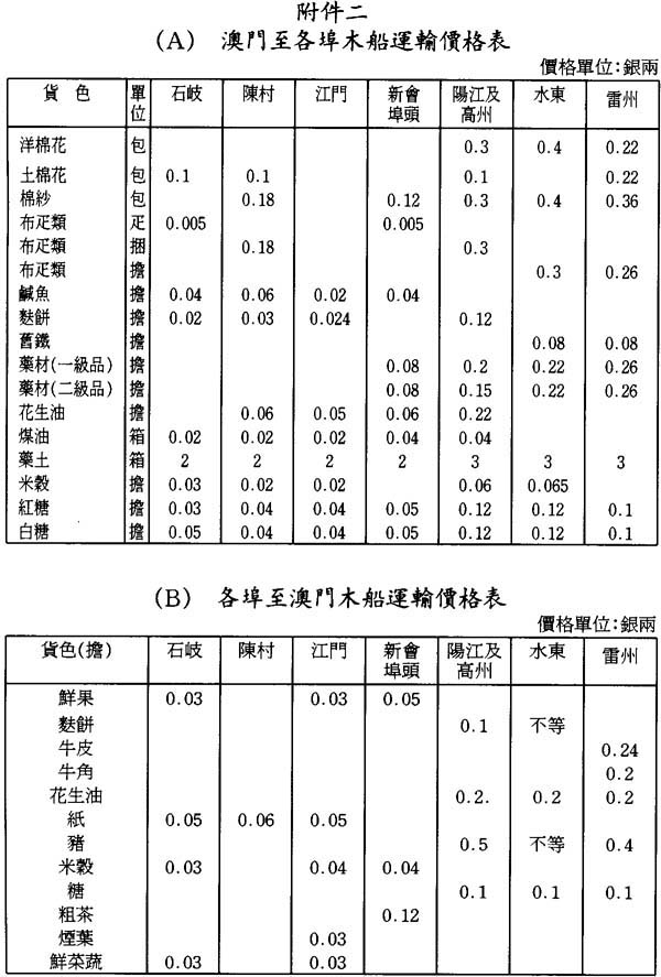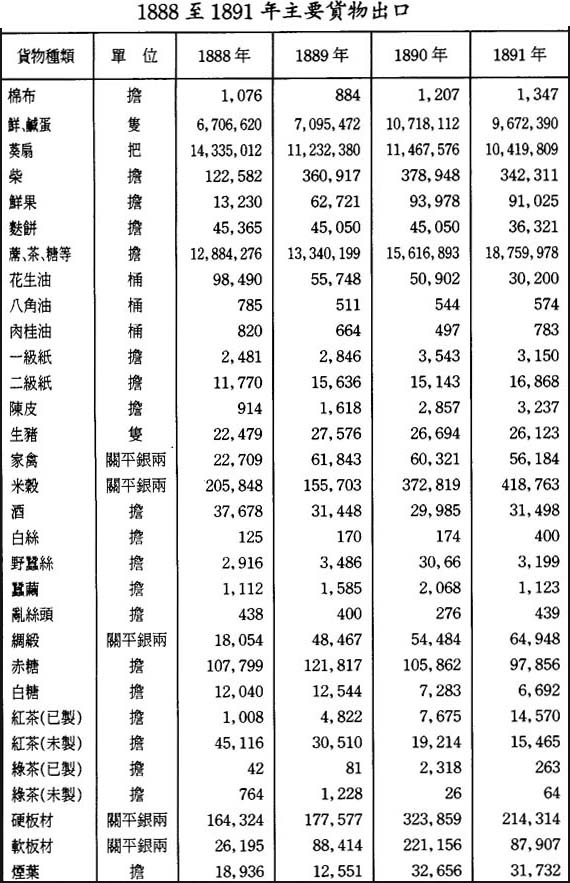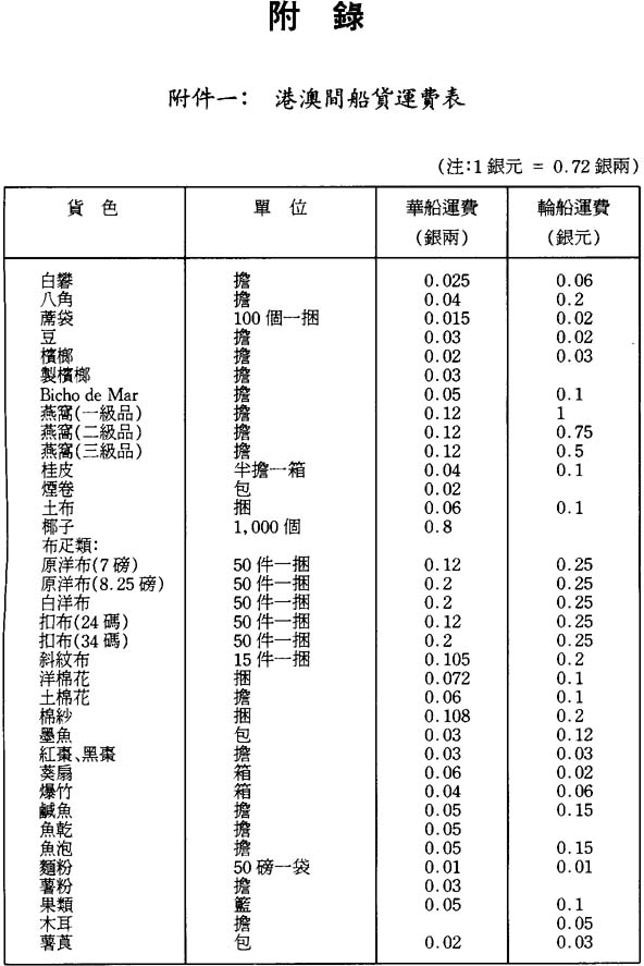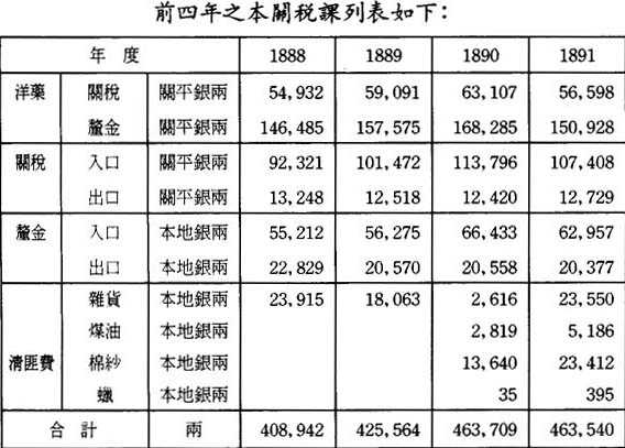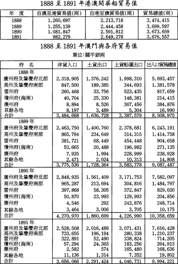 本關在1887年全年尙未發揮作用,該年大量洋藥及其他貨物按減低之稅率入關,若以此不完整的數字作比較,則毫無價値。此後在1888至1891年的四年間,澳門對華貿易年均總値爲九百四十八萬七千兩。其中,洋貨入口年均値銀三百七十九萬七千兩;土貨入口一百八十七萬九千兩,土貨出口値銀三百八十一萬一千兩。香港、澳門之間來往華船貨運,年均値銀三百六十三萬一千兩;其中香港運出的貨値二百四十八萬六千兩,運往香港的貨値一百一十四萬五千兩。至1890年底,貿易總値每年都有增加,1890年尤有巨額增長,其原因主要是1889年底廢除了淸匪費。1891年貿易總値減少將近一百五十萬兩,主要是重新徵收淸匪費所致;其次是由於粵海關與省城釐局同意減少稅釐,致使船隻轉往省城;還由於下文第二十六項特別提及的原因,影響澳門作爲商業中心的地位。相信下列貿易與貨値的比較表,將爲了解其間的情况提供便利:
