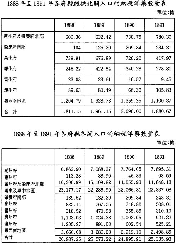 這些表格表明,洋藥入口在粵東各地呈增長之勢,在粵中則趨減少,惟經本關入口者仍有增加。究其減少原因,無疑爲本關年復一年採取更有效之緝私措施所致。然自澳門走私之熟藥,據本地官府估計,每月仍達四十箱。粵西南各府縣經本關及其他各關入口的洋藥則顯著減少,三年共減少一千一百六十擔,減少三成有餘。這是因爲新加坡運來的洋藥數量每年遞增,其船常停泊於荒僻港口,逃避納稅。長此以往,不出七、八年,上述各府將無納稅之入口洋藥,造成國家與粵省稅課的重大損失。必須立即採取措施,禁止此種非法貿易。本人已在1891年的本關貿易報告中,提出相關的措施。