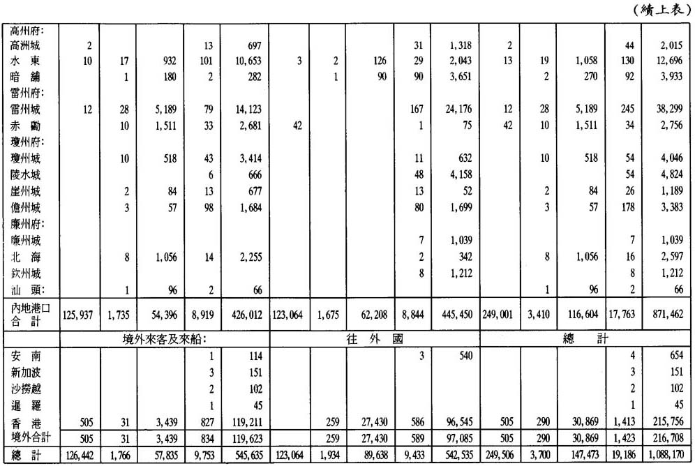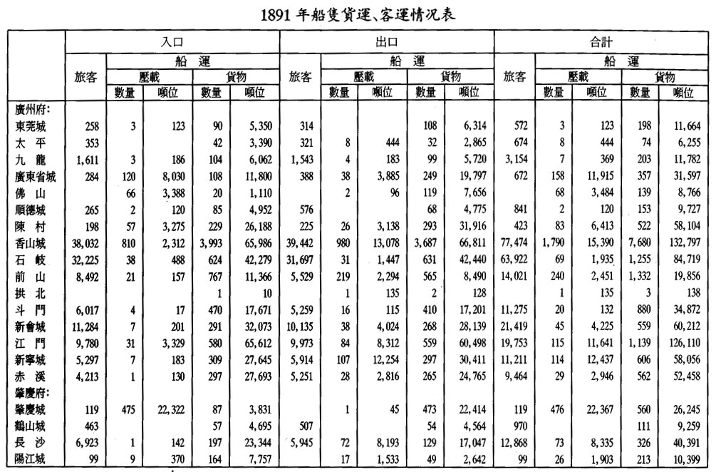 最近兩年才有進出本關的船隻載貨噸數的統計。1890年進出本關的華船共有二萬四千二百五十一隻,載貨一百二十二萬一千三百六十七噸;1891年有二萬二千八百八十六隻,載貨一百二十三萬五千六百四十三噸。下面將附表顯示1891年來往各地的華船載貨量、壓載量及載客量;附圖顯示來往各地的地理位置。此類船隻以及來往港澳的船隻每年的載貨量約共値達二千萬元。運往附近口岸的運費約按貨價的百分之一收取;運往更遠的口岸,則收取更多的運費。所以本地船運有的每年賺取二十萬元有餘。主要商品的收費細節詳見文末附表一和附表二。