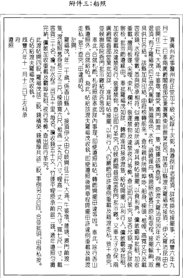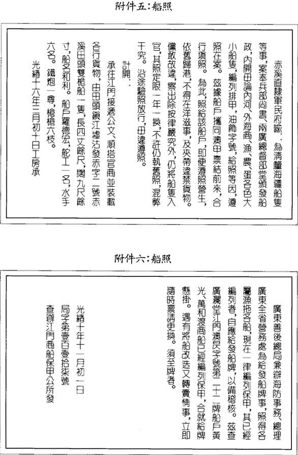 本關通行的執照分兩種:一種直稱“船照”(見文末附件四、附件五),另一種是官府對船主申請的批復(見文末附件三、附件六)。此類執照有的全文徵引上述管理條例,有的僅摘引其中一節,有的則一字不提。有些執照單還增加原先條例所沒有的條款,如禁止夜間航行,不得徵收超出公平價格的運費;限制運貨量與載客人數,一名載客等同一擔貨物;船隻轉售或改造,須換船照等。換句話說,該管理條例多已徒具空文。而今更新船照已無固定期限,有的一年一換,有的五年一換,有的七年一換,有的還不注明期限。即使有期限,也沒有採取措施強制執行。所以文末附件三所抄錄的船照,發照日期爲1856年,迄今仍在使用;附件四的船照也已於兩年前到期。現在船照上極少塡寫各類船員的名字,也不注明規定的航綫,祇說明該船可去“所有沿海口岸”或“所有內河口岸”。船照通常沒有按照管理條例規定,發給指定的船隻,而發給船主。現在船隻攜帶船照出航已成例外,而非常規。其原因是,而今船照由城鎭有權勢者而非由受僱的船主攜帶,已成慣例。船照不轉交給租船者,保留在申請者手中,是便於在經濟拮据的時候,以此作爲貸款的抵押。據我所見,官府發放船照的收費每年二錢至一兩不等。船照的租金視乎船照獲准往返月份的天數,每年二十五兩至五十兩不等。