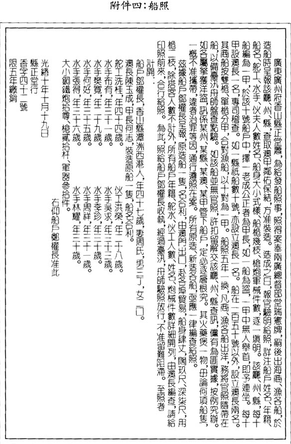 這裡不可能對各類船隻都作描述,僅就其中兩類船隻略加簡介:一爲行駛在附近沿海淺灘、尤其是陽江的寬板船,一爲裝有船尾驅動輪的車船。前者在船槽中央裝有楔形升降板,升降板靠固定於尖端的樞軸轉動,可在淺水處升起,在深水處降下,以穿過之掛勾令其保持預定的高位。至於後者,幾年前在省城出現第一艘船尾輪驅動的車船,以踏車或中國鏈泵的方式,用腳驅動。實際運行的結果表明,其優於帆船,旣省時又省費用,船尾驅動輪便逐步應用在航運內河的商船上。而今車船已隨處可見,甚至在廣西省梧州府也有應用。最近出現的蒸汽拖輪牽拉客船,安全准時,易於防御海盗襲擊。1889年兩廣總督張之洞在核准此舉的時候,堅持提出兩項前提條件:一、蒸汽拖輪應爲華人擁有;二、祇有受拖船的船主才能申請拖運執照。這兩項條件旨在一方面確保華人控制內河交通,另一方面確保以和平、漸進的方式發展輪船航運,以保護現有華船船主的旣得利益,保證他們在新秩序下獲得好處,以免在不同利益衝突者之間形成競爭,引發麻煩,阻延頗爲有利的變革。遺憾的是,將此舉延伸到沿海航運的計劃受到粵海關部的竭力反對,並因此被禁止實施。但拖輪在內河航運則得到廣泛應用,如果不是因爲執照年費高達一千五百至三千三百元不等,此應用將更加普遍。儘管如此,拖輪仍在如下航綫行駛:本埠至陳村、石岐及新會;省城至順德的大良、南海的九江、香山的石岐及小欖、東莞的石龍、新會的河峒、江門、白石、古勞、新寧的新場和朝嶺(Chao lien)、鶴山的小唐基(Suitongki)與大基頭(Takitao),以及省城至赤坎、淡水口(Tamsuihao)和開平的長沙。兩廣總督瑞麟在任期間(1865至1874年間),曾將粵省商船管理條例修訂成典。現在已經很少能看到從前頒發的船照,這是由於船隻使用年限不可能很長,或者由於船照需要定期更新的緣故。文末附件三①有一份船照抄件,錄有當時修訂的條例,全文如下: