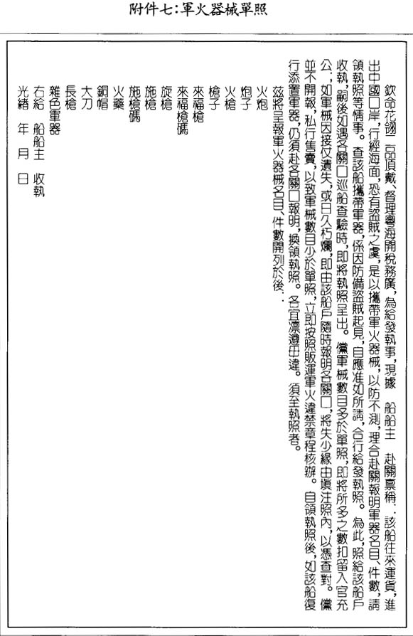 商船除領取各地官府發給的船照之外,還要從海關領取“軍火器械單照”。此單照允許攜帶僅用於自衛的軍火器械,可以隨時申領。上面列明器械的名稱和件數,如有超過,則要罰沒充公;彈藥使用之後,經申述理由、官府同意,可以補充(見文末附件七)。要求船隻攜帶此項單照及其所帶軍火須與單照相符一事,是關係公共利益的重要規定。如果有擔保人提出申請,官府很樂意批准進口軍火器械。根據條約規定,非經官府批准,禁止洋人入口軍火器械;粵省條例也禁止華人私自進口軍械,違例者被視爲勾結海盜,依法懲處。如果不對華船攜帶的軍械嚴加管制,他們就會在內地私行售賣軍火,然後返回澳門補充,有意作惡者還可隨意獲取精良的武器。經調查證實,這種情况已經發生。更有甚者,此地商船持有軍械單照的不足一半。因此,1890 年7月官府下令核查所發之軍械單照,規定所持軍件械數等等。目的祇是查禁內地私售軍械,而不是限制先前允許攜帶的軍火,即每門炮可攜帶二十斤火藥,每支步槍可帶二十發子彈,每名船員可持槍一杆,按船上每兩名乘客增加一杆槍遞增,還可添足彈藥。至提交本報告之日止,本地三百四十六艘出海華船,祇有一百五十一艘持有軍械單照,其餘一百九十五艘則在馬溜洲補發。最近數月查獲華船在內地私售步槍及左輪手槍,證明必須進行軍火管理。對售賣軍火處以雙倍罰款,可以制止此類活動。不過,仍有乘客將左輪手槍和拆散的威切斯特步槍藏在行李中,大量走私運入內地。不可能對所有乘客都進行盤查,可觀的走私收入則使他們甘冒各種風險。於是,盜匪及違法者得到的武器常常比官兵的武器優越,他們以此武器恫嚇守法者,抗拒官府的巡查。粵省官府無疑對此倍感棘手。
