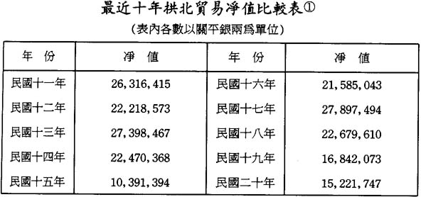 拱北關所轄貿易,僅爲民船運輸貨物,且盡系通過性質,並非各卡附近所產銷者。自稅率提高後,民船經由澳門運來之貨物不復享有低稅特別利益,且拱北並無報稅行及船行代理之便利,故民船進口恆須耽延數日之久,必須報關手續完畢,方准出口,殊欠便利,遂多逕往港粵懋遷,拱北商務乃蒙影響焉。查本期貿易,每况愈下,上期末年貿易凈値數字,尙爲關平銀三千八十五萬四千一百四十七兩。兹將本期各年貿易凈値列表於下,以資比較: