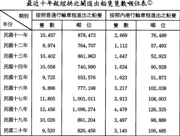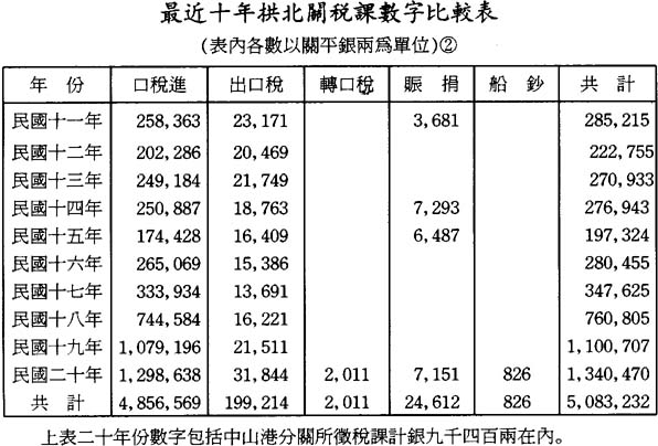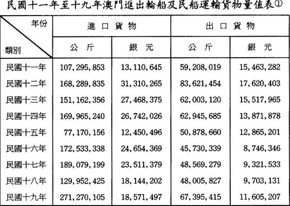 自二十年元旦常關分卡改爲海關民船貿易分卡後,所有經由內地運銷外洋之貨物,均須報經粵海及江門二關出口,拱北關出口貿易遂告式微。兹將澳門殖民政府編制之民國十一年至十九年澳門進出輪船及民船運輸之貨物量値,列表如下: