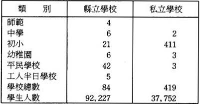 查十載以前,香山縣學校學生數目無幾。比來敎育發達,男女學生百倍於前,共達四萬六千九百七十九人,而爲全國各縣所不可企及。學校數目亦由百所增至五百零三所。此外,歷年前往廣州求學者尙屬甚夥。兹將公私學校及學生數目列表於下: