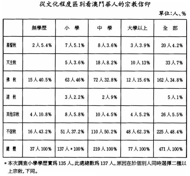 這一份表首先表明:澳門的華人居民仍然保持着孔夫子以來的傳統,有文化的人信仰宗敎的較少,大學學歷中,不信宗敎者高於平均數的16個百分點,而無學歷者與小學學歷者中,不信敎者低於平均數分別爲5個百分點與11個百分點;其次,不同學歷層次的人對待中西宗敎的態度也大有不同,在大學以上學歷的人中,信仰基督敎的百分比與總數持平,而信仰天主敎者明顯多於平均數,幾近一倍;與此形成顯著對照的是:他們中間信仰佛敎者低於平均數一倍,這表明高學歷的信仰宗敎的人中,更傾向於西方宗敎。而在低學歷的人中,信仰西方宗敎者大都在平均線上下浮動,而信仰佛敎者,無學歷者高於平均線的6個百分點,小學學歷者高於平均數的12個百分點,可見,信仰傳統宗敎者主要在低文化層次的人中。十分有意思的是:中學學歷的人在所有領域都是持平的,非常接近平均數,最多上下浮動一、二個百分點。由於媽祖信仰主要是在對佛敎、道敎保有尊敬的人中,所以,我們也可知道:澳門崇拜媽祖者,主要來自低文化水平的人中。