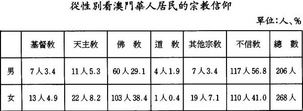 其三,從性別來看澳門華人居民的宗敎信仰。