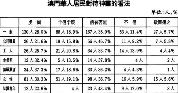 第二,以上數字表明:在澳門華人中間,採取無神論態度的人也是少數,甚至比對神靈持虔誠態度的人更少,後者在總人口裡所佔百分比在20%-37%之間,而前者在人口中所佔百分點僅在4%-17%之,相差一倍。不過最多的還是對神靈持模糊態度的人,或是“半信半疑”,或是“敬而遠之”,或是“信則有不信則無”,尤其以最後一項最多,在各類人中都佔了三分之一以上,甚至接近半數。從性別來看,女性除了“不信”的比例較低於平均數之外,其他各項都接近平均數,沒有太大出入;而在靑年知識分子裡,虔誠者低於平均數5.4個百分點,不信者高於平均數5.6個百分點,回答“半信半疑”的祇有4人,這表明他們作爲澳門的精英,自信程度大大高於普通人,但是,他們中間最多的還是回答“信則有,不信則無”,這種高深莫測的態度最終表明他們對神的態度還是模棱兩可的。