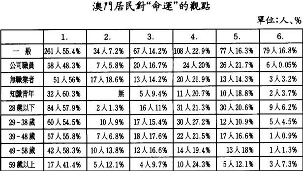答卷人的簡况:在有效答卷471份裡,男202人,女267人,此外有二份未標明性別。(1)其中漢族佔絕對優勢,達463人,佔99.5%,其他民族2人,佔0.4%;國籍情况是:中國籍333人、葡萄牙籍爲124人,其他10人;就原籍看,籍貫廣東的有400人,佔總數的87.3%,籍貫福建的有36人,佔7.8%,其他籍貫的有22 人,佔4.8%;他們的年齡層次是:28歲以下145人,29-38歲爲110人,39-48歲爲102人,49-58歲爲72人,59歲以上41人,共計470人;學歷層次爲:無學歷37人、小學135人、中學219人,大學以上爲75人,可統計者共計466人;職業情况是:全部468 人,其中公務員19佔4%,專業人士21人佔4.5%,職員120人佔25.8%,工人101人佔21.7%,學生46人佔9.9%,企業家37人佔7.9%,水上人家9人佔1.9%,退休24人佔5.2%,無職業91 人佔19.5%;調查地點和人數爲:中區附近118人,靑洲附近51 人,沙梨頭34人,蓮溪57人,路環氹仔36人,觀音堂25人,下灣89人,未明38人,以上可統計共448人。以上情况表明:不論從地理分佈、年齡層次、學歷層次、各階層來說,我們這一調查在澳門是具有代表性的。