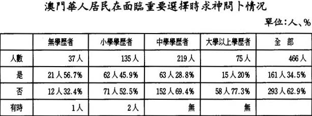該表出乎我們意料之外的是:竟有34.5%的人在面臨重大選擇時,都會去求神問卜,這大大超過相信神靈對人的命有影響的比例,這表明:許多人雖然淡於宗敎,但在遇到問題時,還是忍不住求神問卜,試圖得到某種啓示。這證明,在現代澳門社會,神明的影響仍有相當的潛力。
