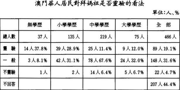 上表告訴我們:從問卷總體看,澳門人中相信求媽祖靈驗的有89 人,一般的有148人,二者合計,相信媽祖有一定靈驗的有237人,佔總數的50.9%。這個比例等於說:澳門有一半以上的相信媽祖有一定的左右人命運的能力,這是澳門媽祖文化存在的堅實基礎。不過,其中堅信的佔總數的19.1%,這是媽祖信仰的基本群衆,而持一般態度的佔總數的31.6%,很顯然,這部分人對媽祖崇拜將信將疑,似信似疑,但他們畢竟成爲媽祖信仰的基本群衆。