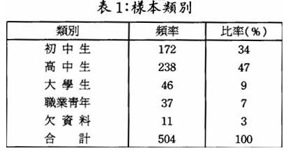 經過不同層面的抽樣,是次調查獲得504份有效樣本,年齡均在15~25歲之間。其分類構成如下:
