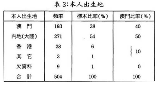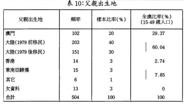 澳門是一個典型的移民社會,人口增長的決定因素取決於內地人口的大量遷入。據1991年澳門人口普查資料顯示,全澳人口中,內地移民人口已佔全澳人口總數50%以上。本次靑少年調查,再次證實了上述趨勢: