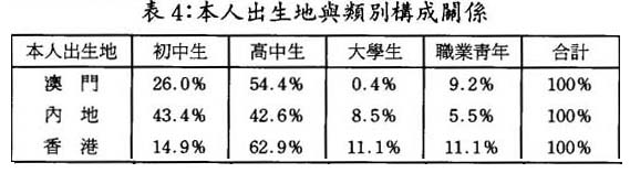 內地出生的本澳靑少年,樣本以中學生居多,佔八成以上;香港出生的本澳靑少年,樣本的年齡、學歷層次均高於內地和澳門出生的靑少年;澳門出生的本澳靑少年,樣本的類別構成介於上述兩者之間: