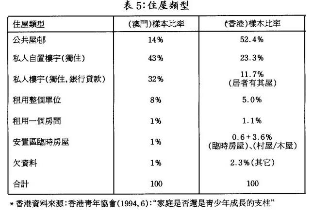 樣本中七成以上靑少年家庭住屋類型爲自置私人樓宇或向銀行貸款的私人樓宇。公共屋邨約佔一成半。租用房屋僅佔一成不到。非永久性建築物僅佔百分之一。與香港靑年協會調查樣本相比,本澳靑少年住屋條件改善得較快。