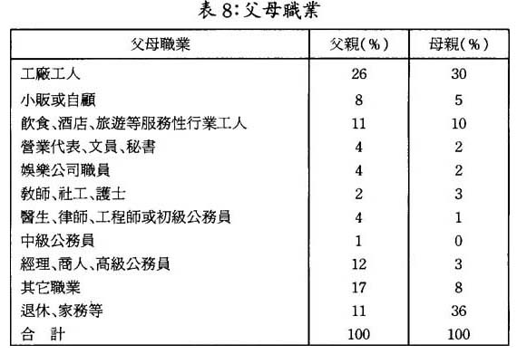 靑年人父親和母親的職業中“藍領”工人各佔四成多;而需要專業訓練的行業,如社工、護士、秘書、文員、敎師、工程師、醫生、律師等“白領”專業人員分別佔14%和8%;高收入階層,如中級以上公務員、經理、商人等則分別佔13%和3%。靑少年的母親居家操持家務約佔三成半。