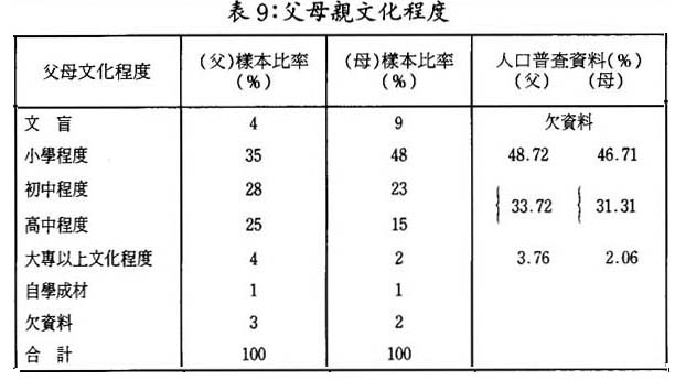樣本中的靑少年父母文化程度,小學:父親佔35%;母親佔48%;中學:父親佔53%,母親佔38%;靑少年父母大專以上學歷比重甚低和母親文盲比重高爲其特徵。樣本中靑年人父母文化程度比全澳人口普查(三歲以上)所獲得資料結果爲高。