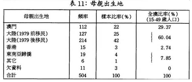 樣本中靑年人父母出生大陸比率各佔七成左右,比全澳總人口中同比來得高,參見表10,表11: