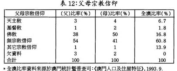 在澳門的三大主要宗敎信仰中,是次調查樣本顯示約有四~五成靑年人父母信仰佛敎,相形之下天主敎徒和基督敎徒人數卻急劇下降。另外自陳沒有宗敎信仰的父母親比率則要佔總數的四~五成,這基本反映了近十多年來大量遷入本澳定居的內地居民無宗敎信仰的現實狀况。