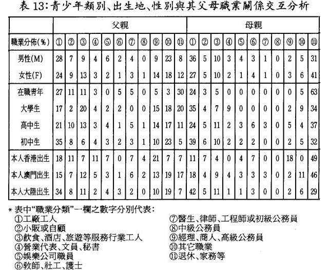 是次調查發現,性別與靑年人父母職業分佈間無必然聯繫,但類別構成和本人出生地卻跟他們父親職業間具有顯著的相關性,而與其母親職業間無明顯相關性,這基本反映了澳門社會男主外,女主內的傳統價値觀念。