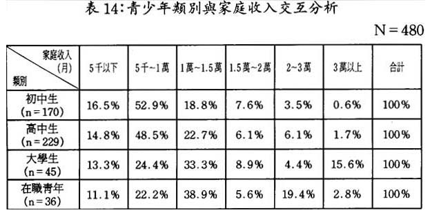 樣本中八成以上靑少年家庭收入在一萬伍千元以下,其中一萬元以下收入約佔58%;二萬以上收入僅佔一成不到: