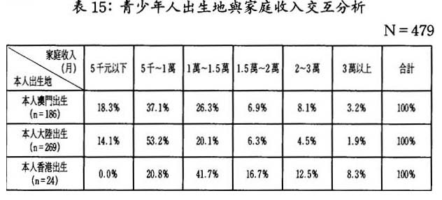 總體上看,大學生和在職靑年之家庭收入水平要明顯高於初中生和高中生家庭收入水平;大陸遷入澳門定居之靑年人家庭,其收入水平要明顯低於出生在本澳和香港之靑年人家庭的收入水平。(參見表14、表15)