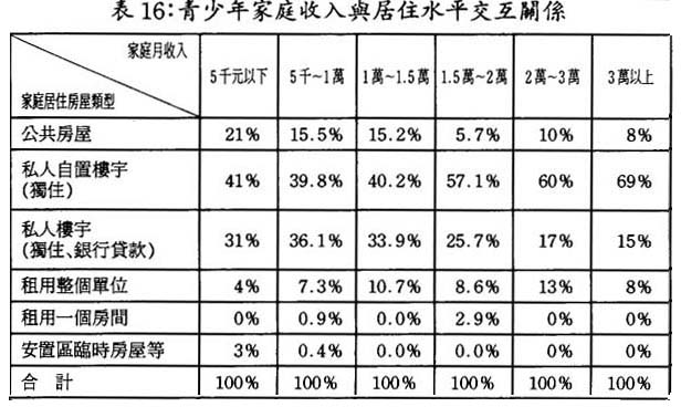 家庭月收入中位數在達到1.5萬元以上的澳門靑少年家庭,其居住水平有一個較明顯的提升,公共屋邨所佔比重明顯下降,而私人樓宇所佔比重明顯上升;(參見表16)