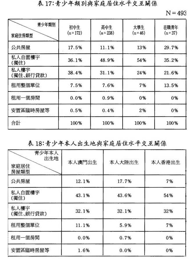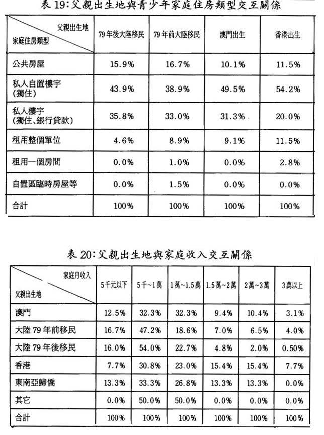 相形之下,父親出生地爲香港的家庭居住水平顯得與其收入水平不太相稱。根據電腦統計,父親爲香港出生的,而家庭收入在1.5萬元以上要佔近39%,(而擁有自置私人樓宇的水平才佔74%,甚至還低於79年後大陸移民水平。父親澳門出生的,其家庭收入在1.5萬元以上佔23%;父親79年前大陸移民家庭收入1.5萬元以上則佔17.5%;而父親爲79年後大陸移民的,家庭收入1.5萬元以上,僅7.5%)。由此可見,父親出生地爲香港的本澳靑少年家庭收入水平與其住房水平反差較大。由於香港毗鄰澳門,父親出生地爲香港的本澳靑少年家庭,在香港可能置有物業。(參見表19表20)