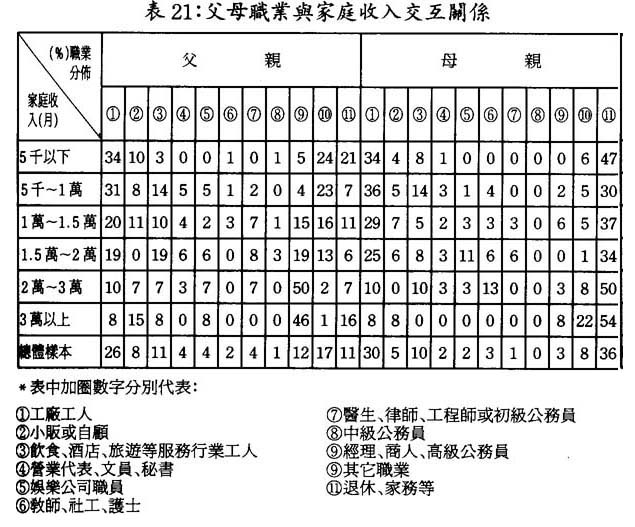 父親爲小販或自顧,飮食、酒店等服務業工人,娛樂公司職員、專業技術人士,在同等家庭收入層面上呈現較爲集中之現象。母親爲敎師、社工和護士,娛樂公司職員,飮食、酒店等服務業工人,專業技術人士,在同等家庭收入層面上也呈較爲集中的趨勢。(參見表21)