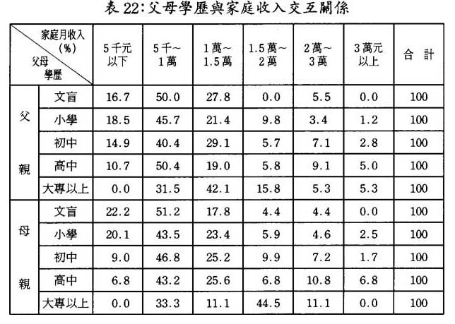 家庭月收入處在5千元以下和3萬元以上兩個極端的層面時,呈現出與父母學歷成正相關之關係,即父母文化程度越低,其家庭收入水平也越低,反之,父母親文化程度越高,其家庭收入水平就越高。高收入中父母文盲爲零,低收入中,父母爲大專以上文化程度亦爲零。(參見表22)