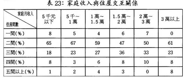 擁有五間以上住房的峰値則在3萬元以上收入的家庭,佔8%。(參見表23)