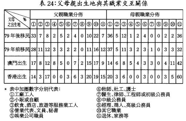 靑少年之母親中,操持家務比率較高,香港出生之母親佔60%,澳門出生之母親佔42%,79年前移民之母親佔32%,79年後移民之母親佔36%。較爲典型地顯示出澳門社會“男主外,女主內”之傳統特徵。母親出生地與職業分佈之交互關係一並在表24示出。