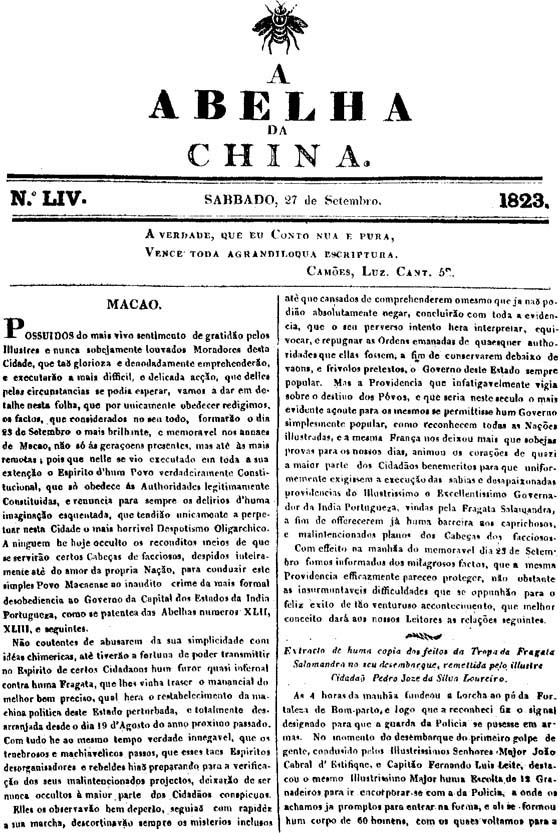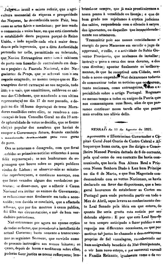 受澳門市政廳(Leal Senad。)的委托,我們認爲,本報編輯的職責,就是眞實全面地將上個月19日澳門居民聚集在自由亭周圍,推翻了忍受多年的專制統治這一事件發生的原因告訴讀者。儘管此項任務非我們力量所能及,但我們並不會因此而放棄。同時,我們也渴望盡綿薄之力,來讚揚這一終結了獨裁統治、鞏固了澳門民衆的權利與義務、並在公衆的歡呼聲和喜悅之情中,按照澳門全體公民的願望成立了臨時政府的壯舉。而這個政府,在它成立後短短的時間裡,通過它對祖國的忠誠,對人民的熱忱以及爲國家謀利的行動,充分證明了自己。