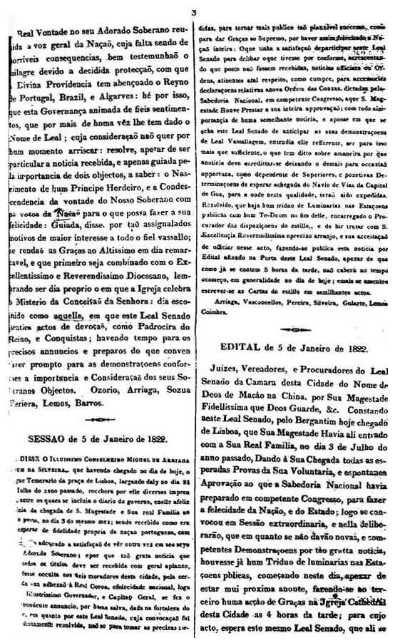 尊貴的總督和司令官毆布基(Joze Ozorio de Castro Cabrale Albuquerque)宣讀了議政官馬努埃爾·佩雷拉(Manoel Pereira)本月8日寫給他的一封信。議政官在信中告訴總督,3月6日,我們高貴的王后生下了一位小王子,並且國王陛下考慮到全民公決的結果,決定順應目前的形勢,爲了全國的利益,將要把整個四月份都在考慮做的一件事變爲現實:把王宮遷回葡萄牙。這就是這封信告知本市政廳的消息,其中的事實給我們帶來了雙重的喜悅一一在許多情况下,由於那萬能之主給予的恩賜,市政府出於對國王的完全的忠誠,總是將這樣的喜事公諸於衆——首先,我們看到了王室有了一位新的男性繼承人;其次,我們看到了忠實於國王的議會代表全國人民發出了呼籲,而國王以崇高的精神接受了這一切。這種忠誠是不可或缺的,缺少了它便會造成可怕的後果。正是出於這種忠誠,在這件事上,上帝才給予葡萄牙、巴西和阿爾加維聯合王國以恩賜。因此,出於最忠誠的願望〔這種忠誠給市政府冠以忠誠的名字(Leal Senado中,Leal意爲忠誠)〕,市政府認爲,這不是一件小事,所以決定,雖然這是一封私人信件,並且其中祇有兩件十分重要的事情:一位王子的誕生和國王恩准了全民公決的結果。但是,這兩件事對所有忠實的僕人來說,都有着重大的意義。考慮到這個重要的原因,同時尊貴的主敎大人又想起這一天正是敎會慶祝聖母受孕的日子,在這樣一個永垂史冊的日子裡,應向高貴的國王表示感謝。爲了這樣一個被選中的日子,市政府將舉行感恩活動,就像慶祝祖國的征服和庇護一樣。這一活動將在發出各種必須的通知、完成各項與這兩件事的重要性和莊嚴性相稱的慶祝活動的準備後開始。