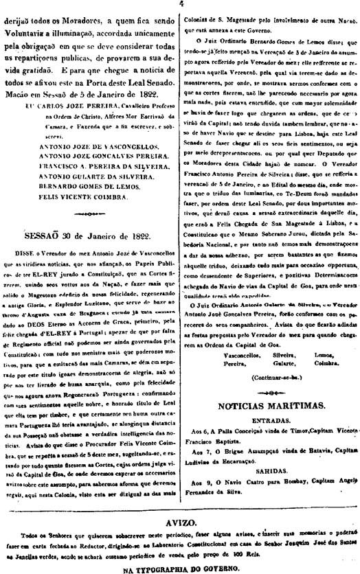 尊敬的市政官員亞利鴉架(Miguel da Arriaga Brum da Silveira)說,去年7月24日從里斯本出發的Demerario號軍艦今天到達澳門。軍艦帶來了一些印刷品,其中有政府的每日公報。公報提到了一個令人振奮的消息:國王和王室成員已於7月3日回到葡萄牙。國王就像是所有忠於葡萄牙的人的希望一樣,受到隆重的歡迎。人民十分高興地看到王室再次回到葡萄牙王國的心臟。鑒於所有葡國公民都應爲這一令人興奮的消息鼓掌歡呼,出於對國王的尊敬,我們決不能將這樣一條傳達了國家大事的消息隱瞞起來而不告知本市公民。爲此,尊敬的總督和軍隊總司令在山頂要塞發佈了莊嚴的命令,立即召開了這次市政會議,以便採取必要措施使這一令人歡欣鼓舞的消息讓更多的人知曉,同時也因王室作出了如此造福整個王國的功績而向國王表示感謝。總督還表示,他十分高興出席市政廳的會議,來仔細體味這一消息。他補充說,鑒於國王接受一些智者在議會提出的建議並同意實行立憲一事尙未得到官方正式的消息,考慮到這一消息的重要性,市政府現在就將它公佈出去爲時尙早。他認爲,作爲上級政府下屬的澳門,這一消息應留待適當的時機,等到果阿的船隻帶來確實的證據,表明這一事件無可置疑時再公佈爲好。兹決定:連續三夜在公共場所點燈,並在最後一天舉行感恩祈禱。由市檢察官負責確定這一活動的方式和必要的規模,並在市政府大門上張貼公告正式宣佈這一活動。祇是由於已接近下午5時,今天可能沒有足夠的時間了。另外,還將對這一事情進行記錄。