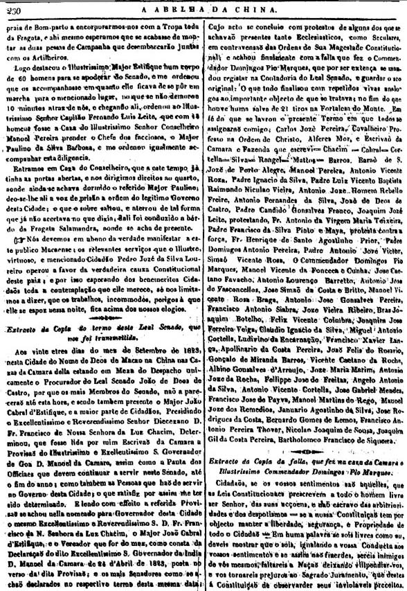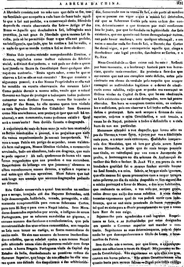如果我們注意到有關我們的祖國實行立憲的消息到達澳門時引起的不安;如果我們回憶起有人曾試圖盜竊那些從里斯本來的公開的文件;如果我們觀察到那些眞正的愛國者所遭到的無理的斥責與威脅;如果我們指出接受立憲制度是對政府成員的刺激;如果我們認眞思考以上的事件,我們就會毫無疑問地得出這樣一個結論:政府最終向公衆表示接受立憲制度,祇不過是特定環境下的權宜之計,決不是眞正的愛國主義的表現。