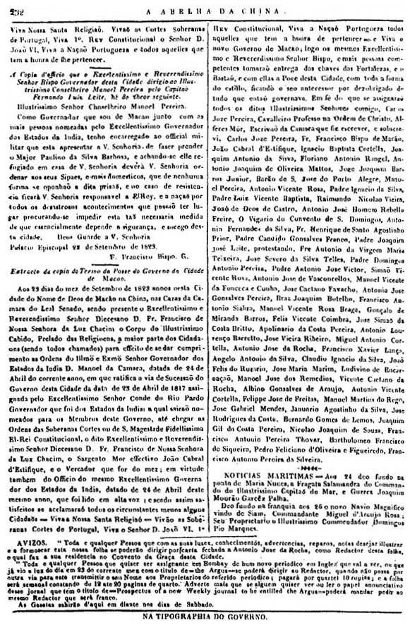 滿懷對本城高貴且無論如何讚美也不過份的居民,在險惡的情况下自發地完成了一件極爲困難和艱巨的任務的最誠摯的感激之情,我們將在本期完成我們應盡的義務,詳細介紹那使9月23 日成爲澳門歷史上不光對我們,對今後世世代代的澳門人來說都是光榮的和値得紀念的日子的各種細節。在那一天,我們見到了眞正熱愛憲法的優秀的民衆全身心地展現他們的精神,他們祇服從合乎憲法的政府,將那一心想要把澳門置於可怕的獨裁統治之下的邪惡企圖拒之門外。今天,對所有的人來說,那些企圖引誘澳門民衆犯下在本報第17、18期以及隨後幾期中提到的違抗葡萄牙印度州首府果阿政府的命令的罪行的叛黨頭目的邪惡行徑,已經不應再被隱瞞了。
