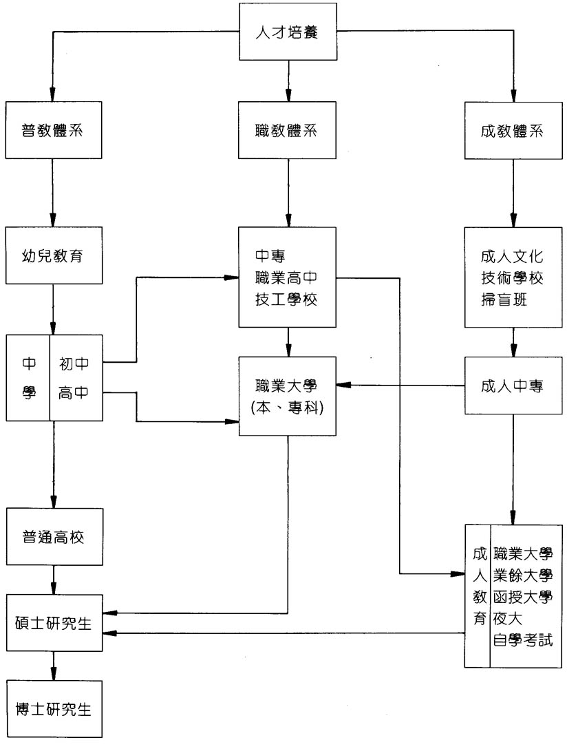 目前在珠江三角洲地區正在建立一個與地方經濟發展、產業調整相適應的敎育體系,即普通敎育、職業技術敎育與成人敎育三者齊頭並進,互相補充,形成一個大的敎育網絡體系⑧: