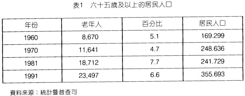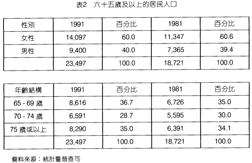 在老年人口的性別及年齡的結構方面,與一九八一年比較,一九九一年底女性的人數較多,約為60%。在這兩個時期內七十五歲及以上的老年人相等於總老年人口的三份之一。(表2)