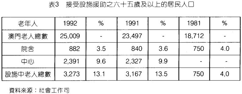 在一九八一年,約有七百五十名老年人,約佔總老年人口的4%,受當時的八所院舍援助。(表3)