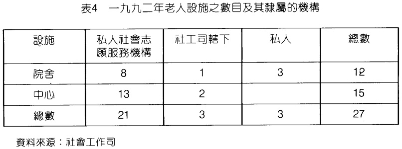 老年人社會設施的總數由一九八一年的八間增至一九九二年的二十七間,其中宗敎組織及街坊總會與工聯等社會志願服務機構在老人服務工作方面貢獻最大。(表4)